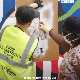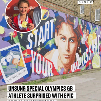 A while ago we were contacted by LadBible, after they saw our wonderful Arts for All mural by Will Redgrove, they asked if we would be a part of another big mural they were planning for a Special Olymics Athlete. They commissioned Will to create this mural and invited us down to help paint it.